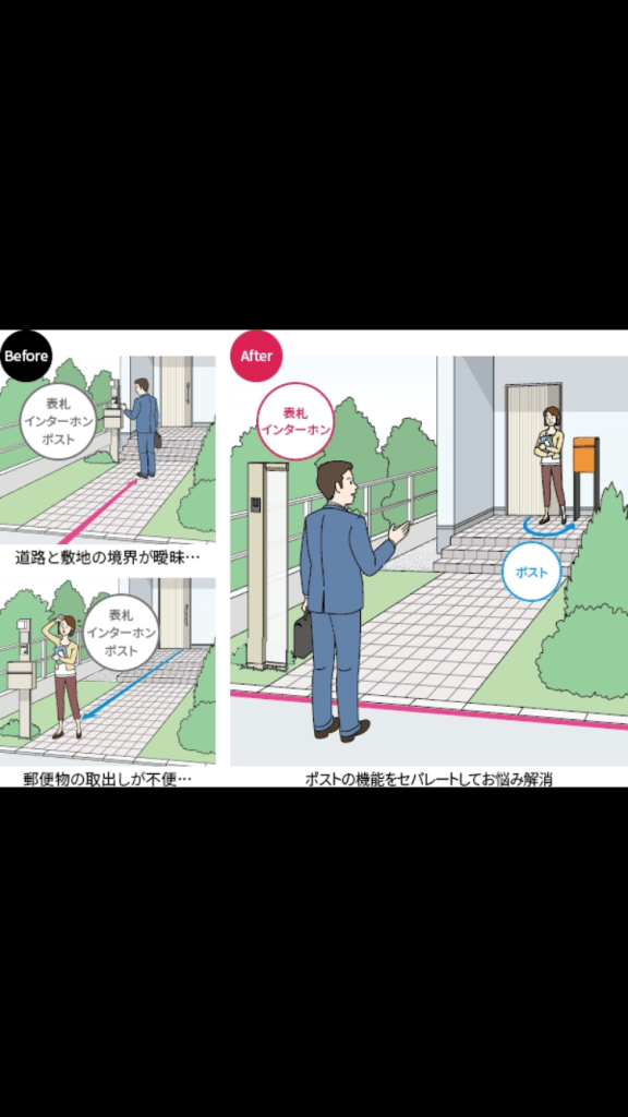 玄関から道路まで距離があり、インターホンは道路側に欲しいけどポストは遠いと大変だから玄関の近くに欲しい方にはもってこいです。