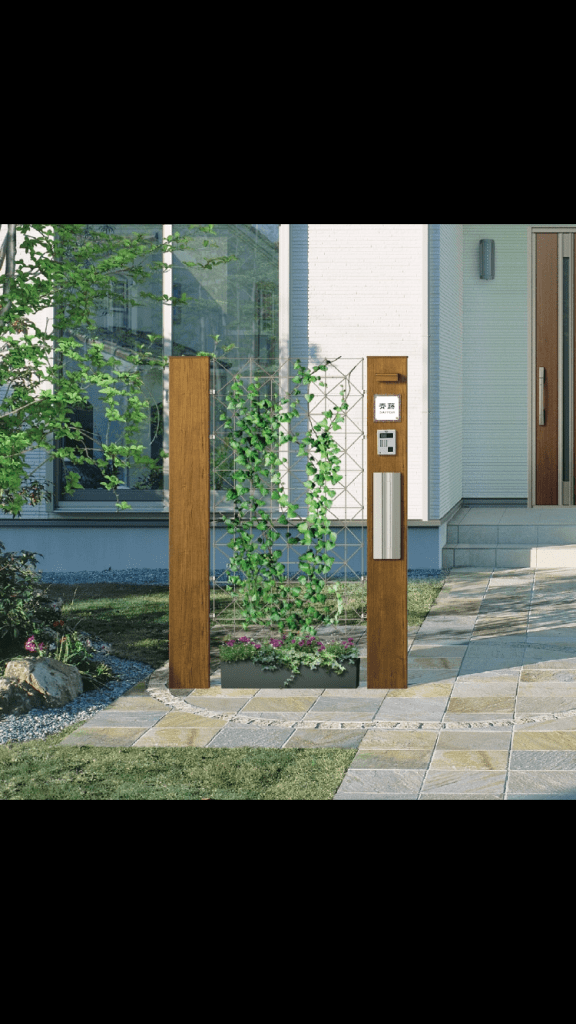 表札、インターホン、ポストを備えた門柱タイプの機能ポール。